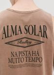 A regata traz estampa posterior marcante com tipografia clássica e identidade vintage. A arte reforça o espírito solar da marca, conectando pista, areia e as ruas do Rio em uma só narrativa.
