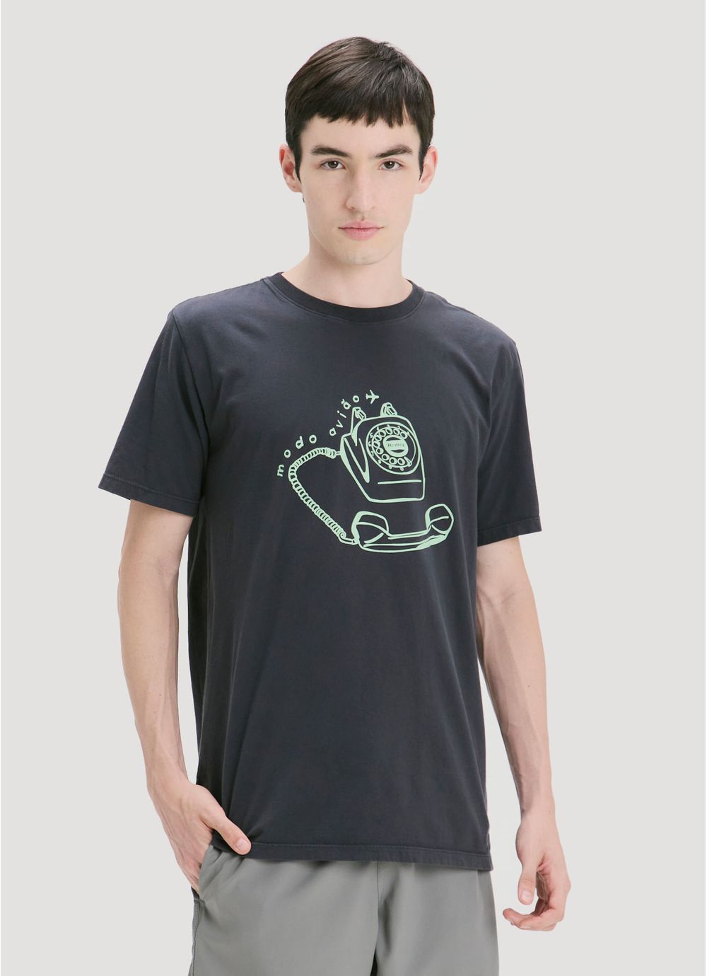 Com a estampa frontal inspirada em telefone retrô e mood “modo avião”, a peça traz uma leitura leve e bem-humorada sobre viajar, pausar e viver o momento. O efeito estonado garante visual vintage e toque macio, enquanto a modelagem confortável acompanha a rotina com autenticidade.